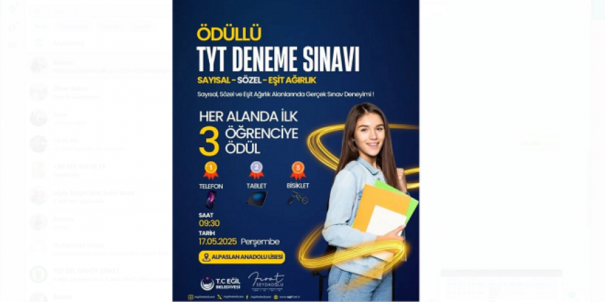 Eğil Belediyesi tarafından düzenlenecek olan TYT Deneme Sınavında, en başarılı ilk 3 öğrenciye ödül verileceği duyuruldu. Peki, sınav ne zaman yapılacak? İşte yanıtı…